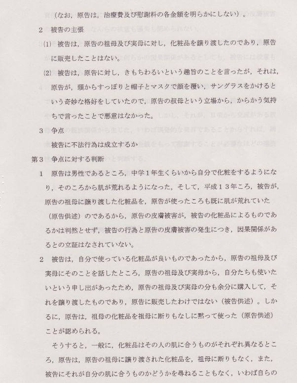 原告が化粧品による皮膚被害に関して注意したにもかかわらず、 消費者に対して販売する過程で、注意義務を怠たったこと、 化粧品による皮膚被害の真実を知っていながら販売、あるいは強制的に原告に すすめたことなどの不法行為責任 と 原告が化粧品による皮膚被害で精神的に追い詰められている状態の時に、 原告に対して言葉などで行なわれた行為に対しての侮辱罪または名誉毀損 の複合で訴訟したのですが・・・ レーザー施術のダウンタイム時に言われた「頭おかしんじゃないの、病院行け」 「なにその顔きもちわるい」などが侮辱罪にさえならなかったのが・・・ 証拠のボイスレコーダーで発言したことは証明できてるのに、 「法的に金銭をもって慰謝することが必要なほどの違法性があるとはいえない」として棄却。 参考程度に判決文と相手から送られてきた手紙を掲載します。 (ちなみに訴訟以外で金銭を要求したことはありません。なので相手には証拠がないはずです) (手紙を送ってきた相手は裁判の当事者ではありませんし、まともに話した経験のない相手です) (告訴したおぼえもありません) 控訴して勝てる可能性ありますか?