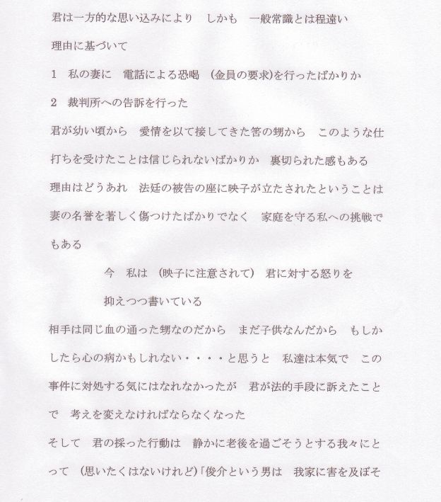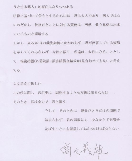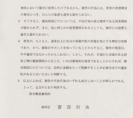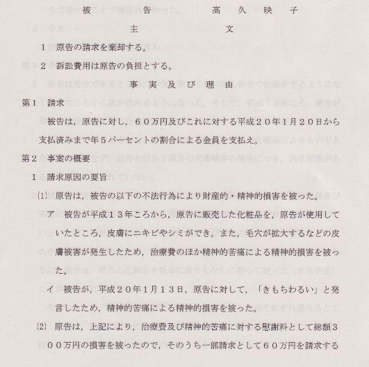 原告が化粧品による皮膚被害に関して注意したにもかかわらず、 消費者に対して販売する過程で、注意義務を怠たったこと、 化粧品による皮膚被害の真実を知っていながら販売、あるいは強制的に原告に すすめたことなどの不法行為責任 と 原告が化粧品による皮膚被害で精神的に追い詰められている状態の時に、 原告に対して言葉などで行なわれた行為に対しての侮辱罪または名誉毀損 の複合で訴訟したのですが・・・ レーザー施術のダウンタイム時に言われた「頭おかしんじゃないの、病院行け」 「なにその顔きもちわるい」などが侮辱罪にさえならなかったのが・・・ 証拠のボイスレコーダーで発言したことは証明できてるのに、 「法的に金銭をもって慰謝することが必要なほどの違法性があるとはいえない」として棄却。 参考程度に判決文と相手から送られてきた手紙を掲載します。 (ちなみに訴訟以外で金銭を要求したことはありません。なので相手には証拠がないはずです) (手紙を送ってきた相手は裁判の当事者ではありませんし、まともに話した経験のない相手です) (告訴したおぼえもありません) 控訴して勝てる可能性ありますか?